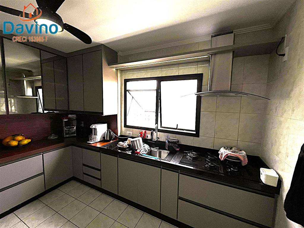 Cozinha toda planejada de primeira qualidade, bancada em mármore e fogão cook-top com coifa, ambiente altamente arejado.