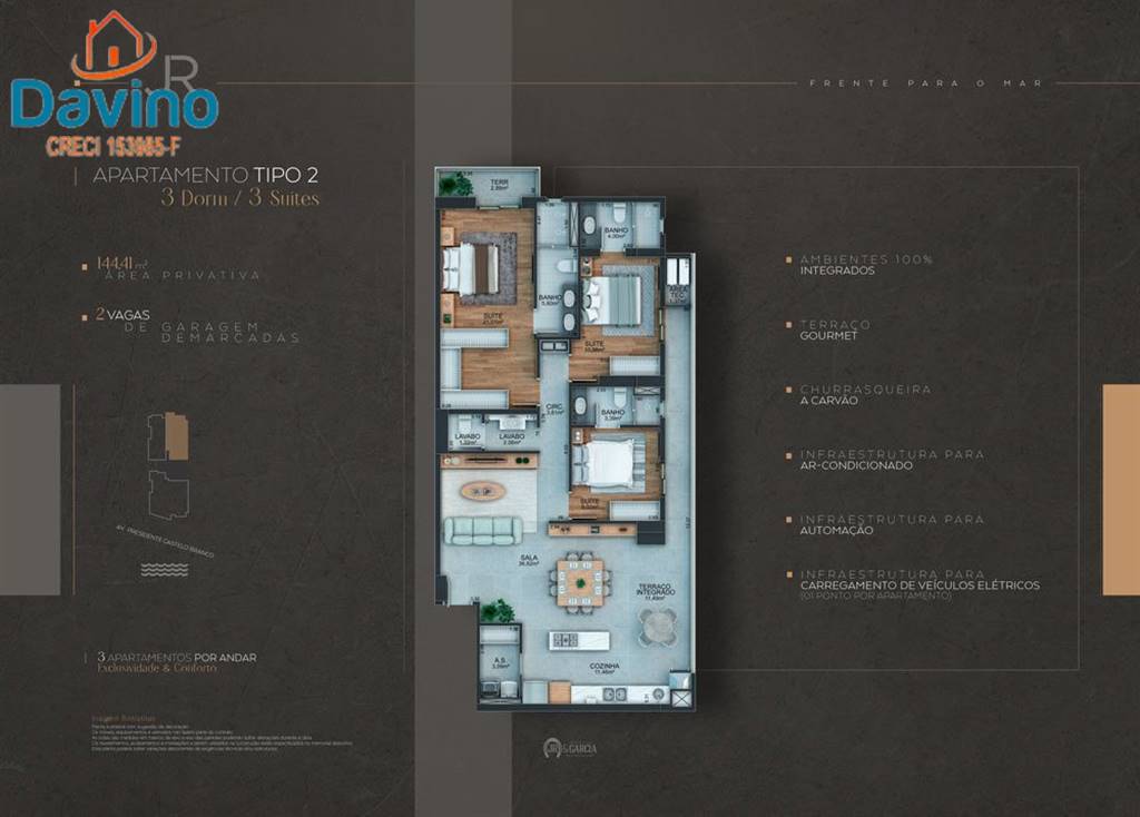 Apartamentos de 03 dormitórios com plantas de 144,41 m2 Cozinha/Sala e Terraço Gopurmet, totalmente integrados