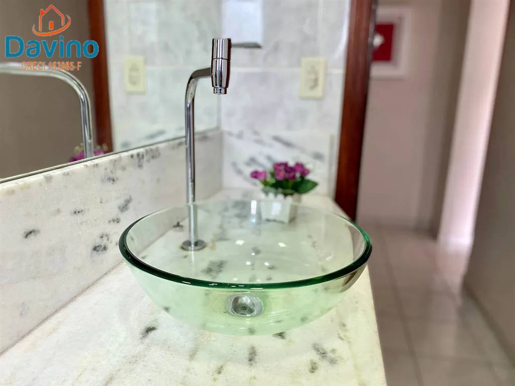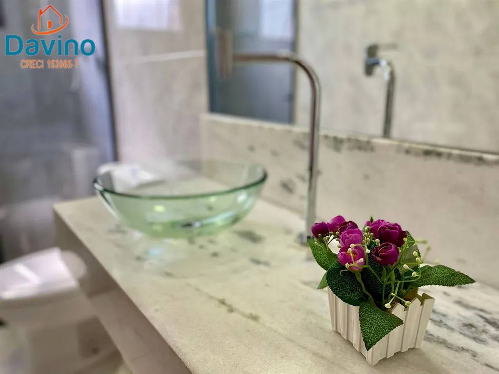 BANHEIRO SOCIAL COM PIA EM MARMORA MODERNA, CUBA ESPECIAL EM VIDRO E BOX BLINDEX E ARMÁRIO